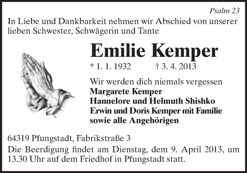 Hier finden Sie alle Traueranzeigen aus der Zeitung, die bisher für Emilie Kemper erschienen sind. Weitere Traueranzeigen, die in der Zeitung erscheinen, werden hier ebenfalls aufgelistet