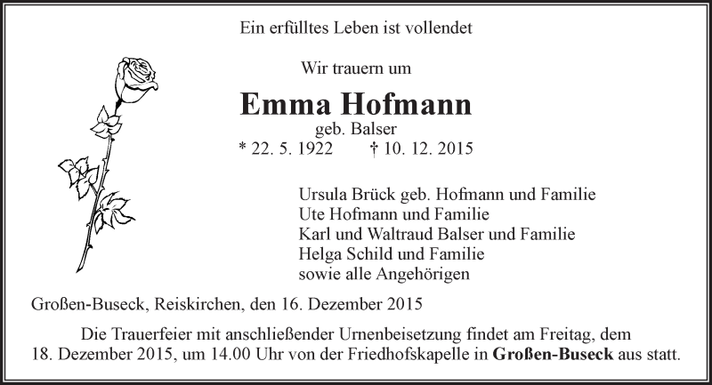 Hier finden Sie alle Traueranzeigen aus der Zeitung, die bisher für Emma Hofmann erschienen sind. Weitere Traueranzeigen, die in der Zeitung erscheinen, werden hier ebenfalls aufgelistet
