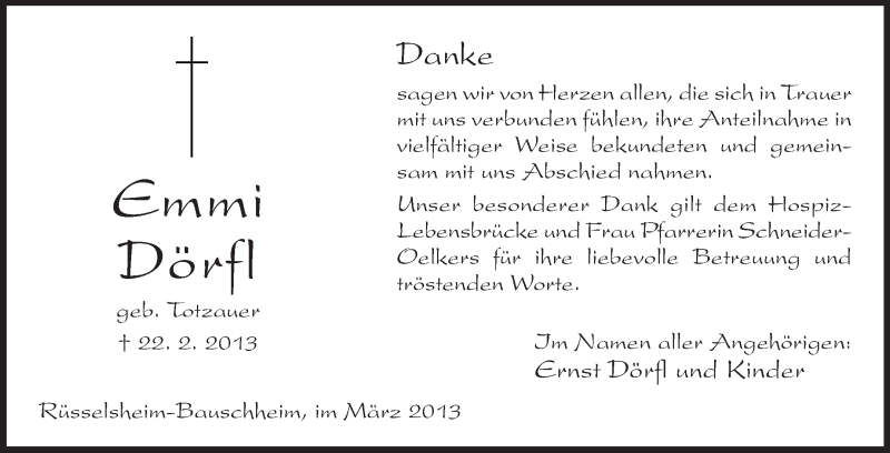 Hier finden Sie alle Traueranzeigen aus der Zeitung, die bisher für Emmi Dörfl erschienen sind. Weitere Traueranzeigen, die in der Zeitung erscheinen, werden hier ebenfalls aufgelistet