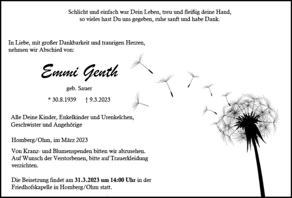 Hier finden Sie alle Traueranzeigen aus der Zeitung, die bisher für Emmi Genth erschienen sind. Weitere Traueranzeigen, die in der Zeitung erscheinen, werden hier ebenfalls aufgelistet