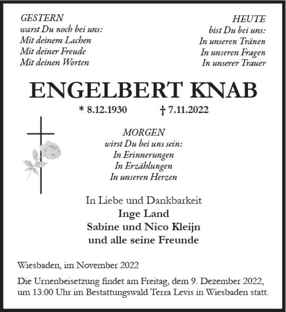 Hier finden Sie alle Traueranzeigen aus der Zeitung, die bisher für Engelbert Knab erschienen sind. Weitere Traueranzeigen, die in der Zeitung erscheinen, werden hier ebenfalls aufgelistet