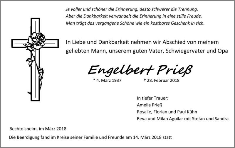 Hier finden Sie alle Traueranzeigen aus der Zeitung, die bisher für Engelbert Prieß erschienen sind. Weitere Traueranzeigen, die in der Zeitung erscheinen, werden hier ebenfalls aufgelistet