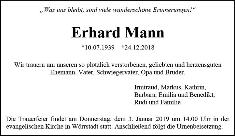 Hier finden Sie alle Traueranzeigen aus der Zeitung, die bisher für Erhard Mann erschienen sind. Weitere Traueranzeigen, die in der Zeitung erscheinen, werden hier ebenfalls aufgelistet