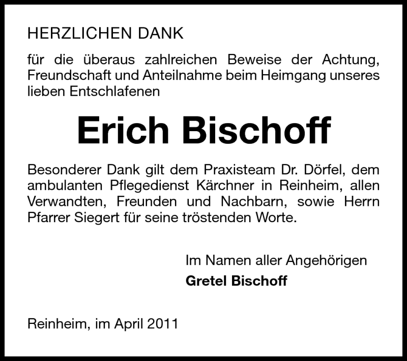 Hier finden Sie alle Traueranzeigen aus der Zeitung, die bisher für Erich Bischoff erschienen sind. Weitere Traueranzeigen, die in der Zeitung erscheinen, werden hier ebenfalls aufgelistet