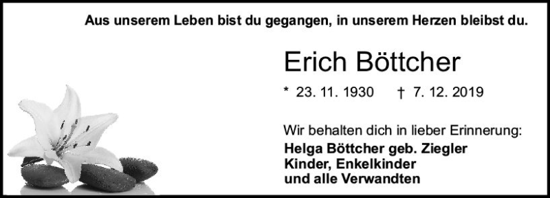 Hier finden Sie alle Traueranzeigen aus der Zeitung, die bisher für Erich Böttcher erschienen sind. Weitere Traueranzeigen, die in der Zeitung erscheinen, werden hier ebenfalls aufgelistet