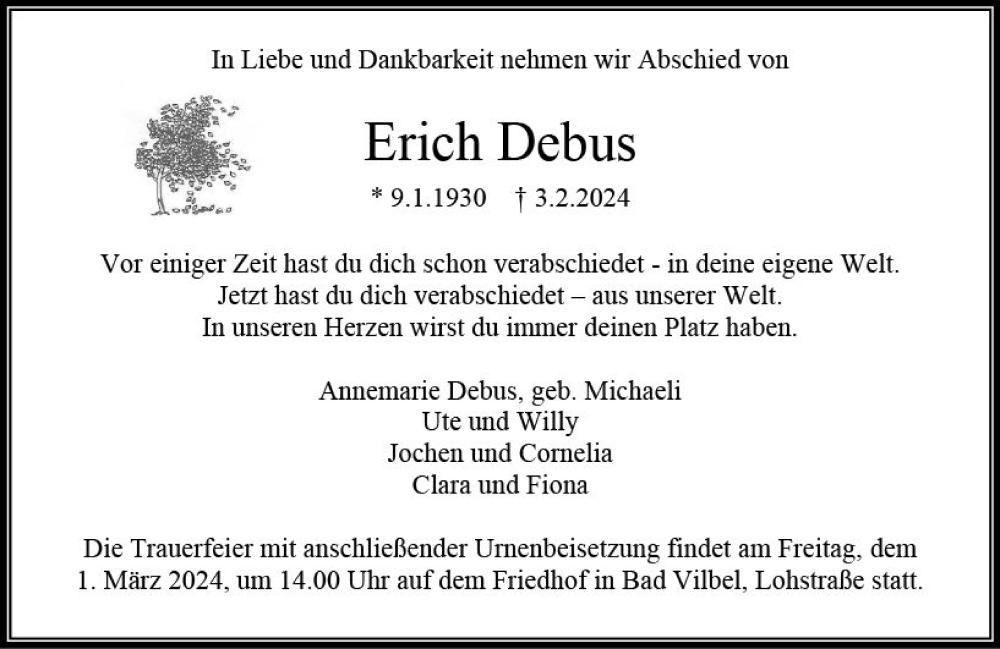 Hier finden Sie alle Traueranzeigen aus der Zeitung, die bisher für Erich Debus erschienen sind. Weitere Traueranzeigen, die in der Zeitung erscheinen, werden hier ebenfalls aufgelistet