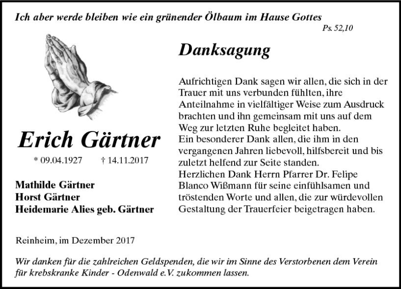 Hier finden Sie alle Traueranzeigen aus der Zeitung, die bisher für Erich Gärtner erschienen sind. Weitere Traueranzeigen, die in der Zeitung erscheinen, werden hier ebenfalls aufgelistet