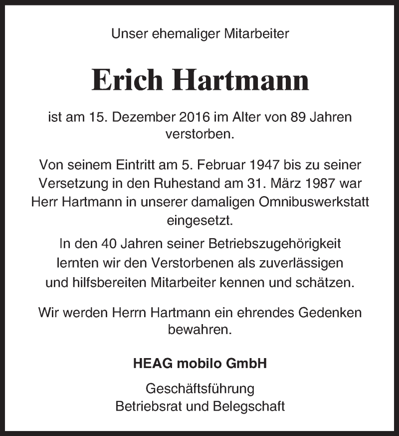 Hier finden Sie alle Traueranzeigen aus der Zeitung, die bisher für Erich Hartmann erschienen sind. Weitere Traueranzeigen, die in der Zeitung erscheinen, werden hier ebenfalls aufgelistet