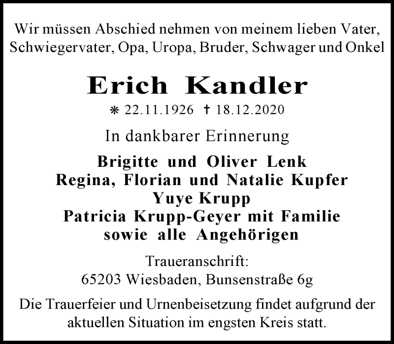 Hier finden Sie alle Traueranzeigen aus der Zeitung, die bisher für Erich Kandler erschienen sind. Weitere Traueranzeigen, die in der Zeitung erscheinen, werden hier ebenfalls aufgelistet