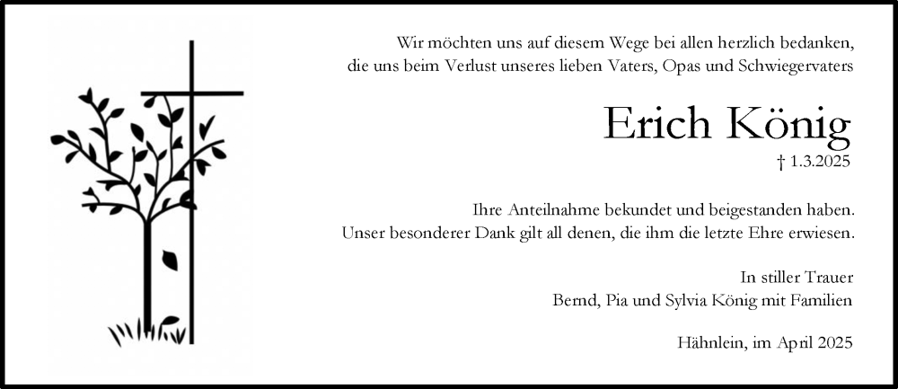 Hier finden Sie alle Traueranzeigen aus der Zeitung, die bisher für Erich König erschienen sind. Weitere Traueranzeigen, die in der Zeitung erscheinen, werden hier ebenfalls aufgelistet
