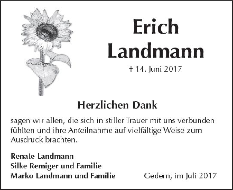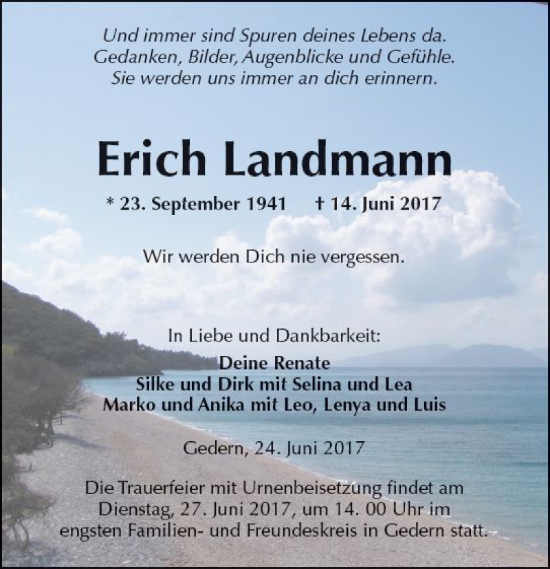 Hier finden Sie alle Traueranzeigen aus der Zeitung, die bisher für Erich Landmann erschienen sind. Weitere Traueranzeigen, die in der Zeitung erscheinen, werden hier ebenfalls aufgelistet