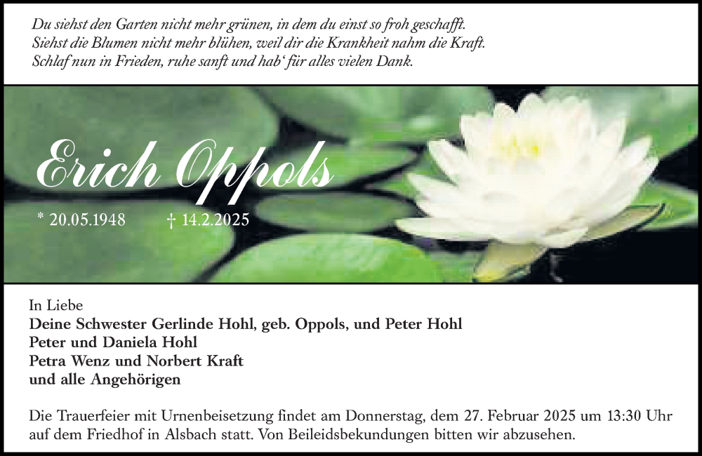 Hier finden Sie alle Traueranzeigen aus der Zeitung, die bisher für Erich Oppols erschienen sind. Weitere Traueranzeigen, die in der Zeitung erscheinen, werden hier ebenfalls aufgelistet