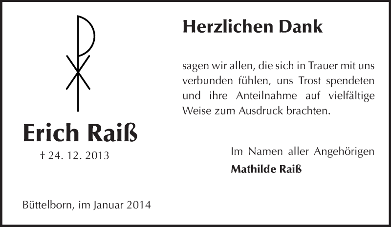Hier finden Sie alle Traueranzeigen aus der Zeitung, die bisher für Erich Raiß erschienen sind. Weitere Traueranzeigen, die in der Zeitung erscheinen, werden hier ebenfalls aufgelistet