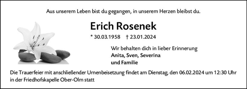 Hier finden Sie alle Traueranzeigen aus der Zeitung, die bisher für Erich Rosenek erschienen sind. Weitere Traueranzeigen, die in der Zeitung erscheinen, werden hier ebenfalls aufgelistet