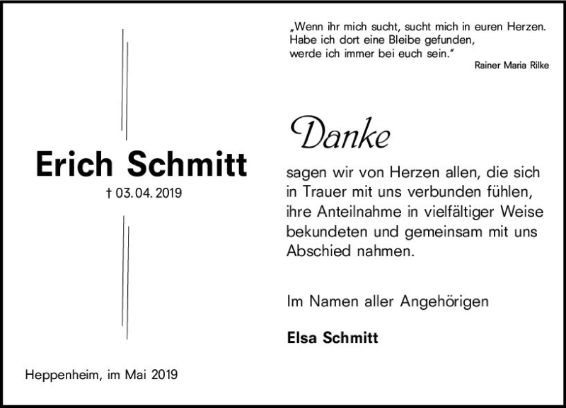 Hier finden Sie alle Traueranzeigen aus der Zeitung, die bisher für Erich Schmitt erschienen sind. Weitere Traueranzeigen, die in der Zeitung erscheinen, werden hier ebenfalls aufgelistet