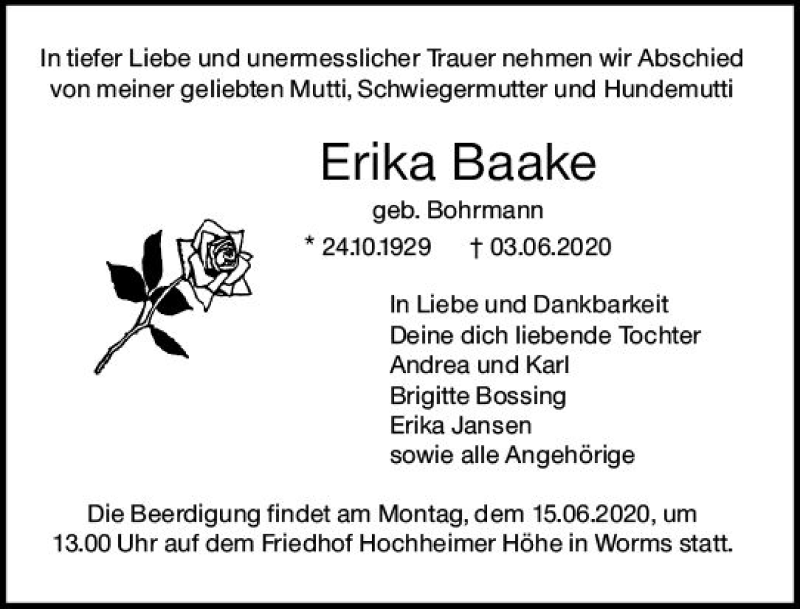 Hier finden Sie alle Traueranzeigen aus der Zeitung, die bisher für Erika Baake erschienen sind. Weitere Traueranzeigen, die in der Zeitung erscheinen, werden hier ebenfalls aufgelistet