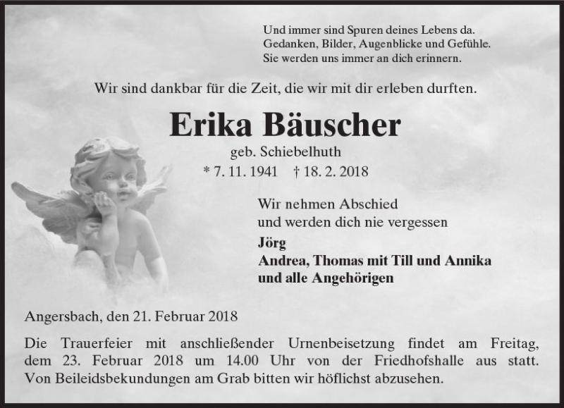 Hier finden Sie alle Traueranzeigen aus der Zeitung, die bisher für Erika Bäuscher erschienen sind. Weitere Traueranzeigen, die in der Zeitung erscheinen, werden hier ebenfalls aufgelistet