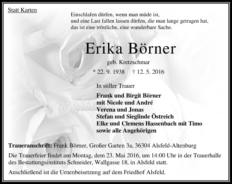 Hier finden Sie alle Traueranzeigen aus der Zeitung, die bisher für Erika Börner erschienen sind. Weitere Traueranzeigen, die in der Zeitung erscheinen, werden hier ebenfalls aufgelistet