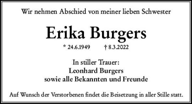 Hier finden Sie alle Traueranzeigen aus der Zeitung, die bisher für Erika Burgers erschienen sind. Weitere Traueranzeigen, die in der Zeitung erscheinen, werden hier ebenfalls aufgelistet