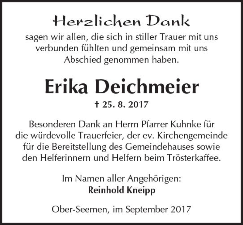 Hier finden Sie alle Traueranzeigen aus der Zeitung, die bisher für Erika Deichmeier erschienen sind. Weitere Traueranzeigen, die in der Zeitung erscheinen, werden hier ebenfalls aufgelistet