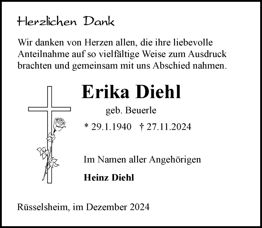 Hier finden Sie alle Traueranzeigen aus der Zeitung, die bisher für Erika Diehl erschienen sind. Weitere Traueranzeigen, die in der Zeitung erscheinen, werden hier ebenfalls aufgelistet