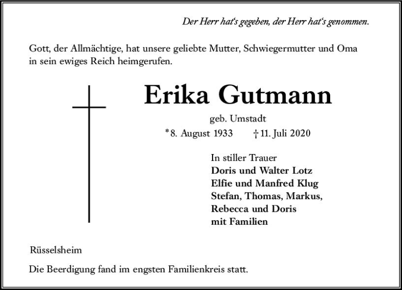 Hier finden Sie alle Traueranzeigen aus der Zeitung, die bisher für Erika Gutmann erschienen sind. Weitere Traueranzeigen, die in der Zeitung erscheinen, werden hier ebenfalls aufgelistet