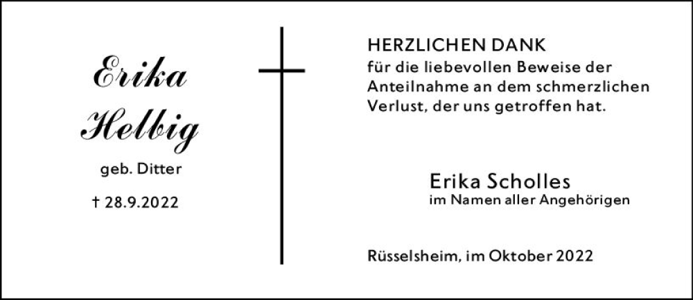 Hier finden Sie alle Traueranzeigen aus der Zeitung, die bisher für Erika Helbig erschienen sind. Weitere Traueranzeigen, die in der Zeitung erscheinen, werden hier ebenfalls aufgelistet
