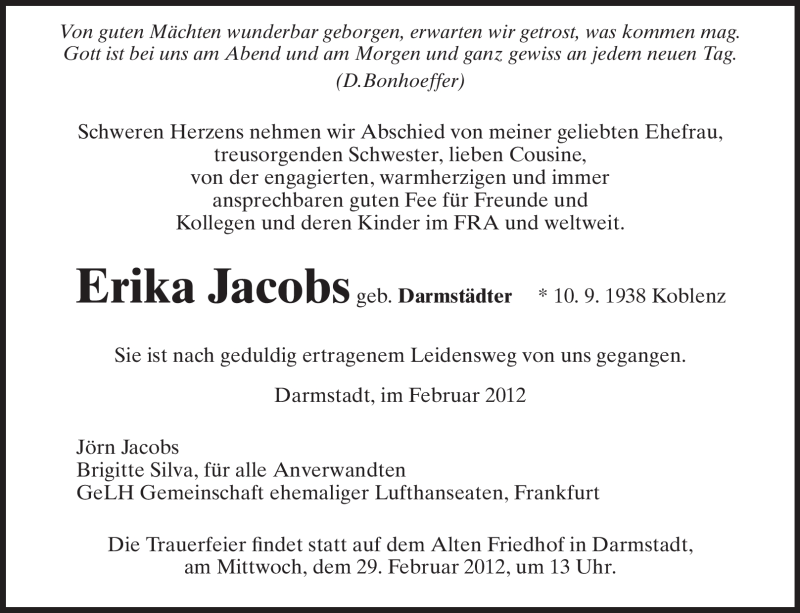 Hier finden Sie alle Traueranzeigen aus der Zeitung, die bisher für Erika Jacobs erschienen sind. Weitere Traueranzeigen, die in der Zeitung erscheinen, werden hier ebenfalls aufgelistet