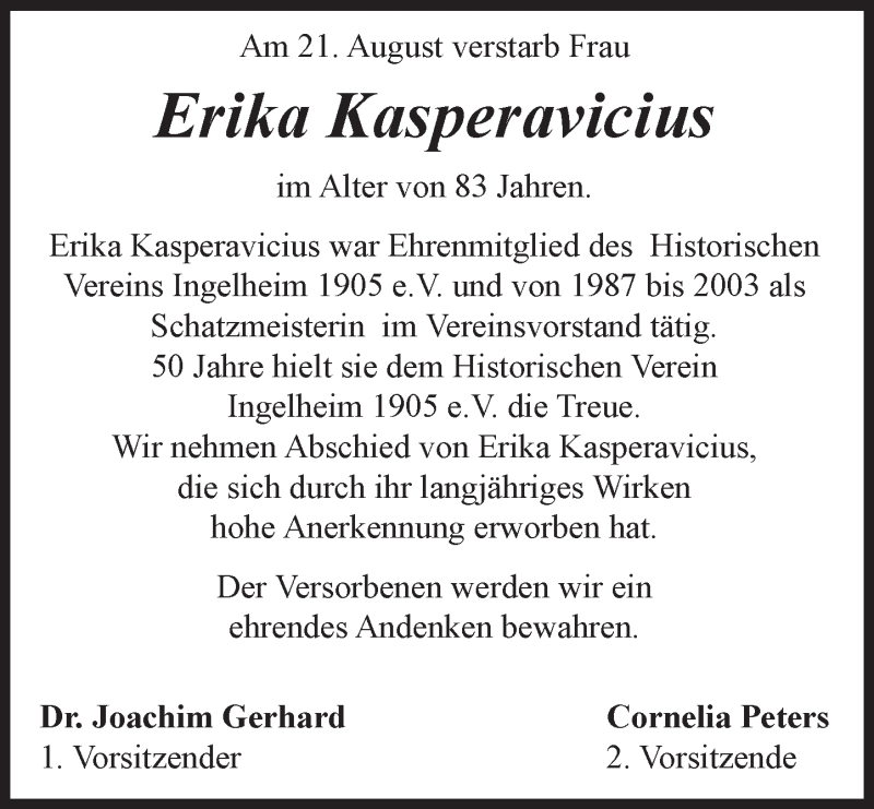 Hier finden Sie alle Traueranzeigen aus der Zeitung, die bisher für Erika Kasperavicius erschienen sind. Weitere Traueranzeigen, die in der Zeitung erscheinen, werden hier ebenfalls aufgelistet