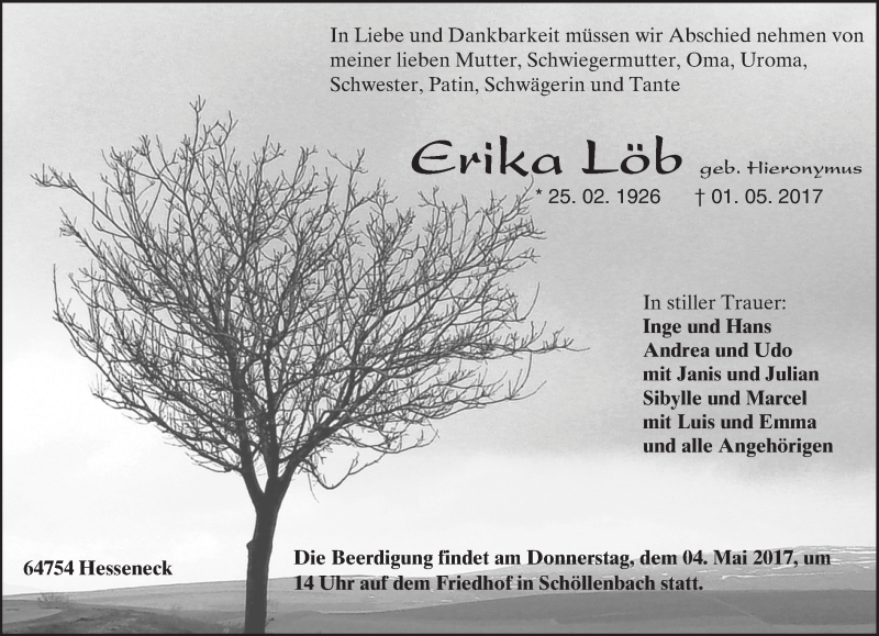 Hier finden Sie alle Traueranzeigen aus der Zeitung, die bisher für Erika Löb erschienen sind. Weitere Traueranzeigen, die in der Zeitung erscheinen, werden hier ebenfalls aufgelistet