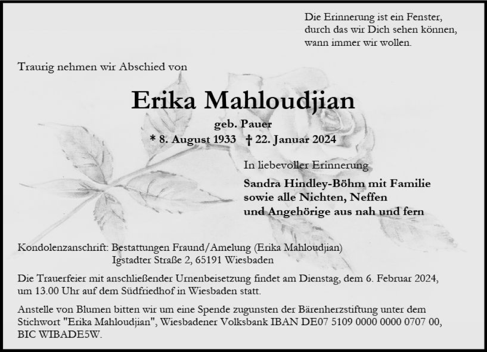 Hier finden Sie alle Traueranzeigen aus der Zeitung, die bisher für Erika Mahloudjian erschienen sind. Weitere Traueranzeigen, die in der Zeitung erscheinen, werden hier ebenfalls aufgelistet