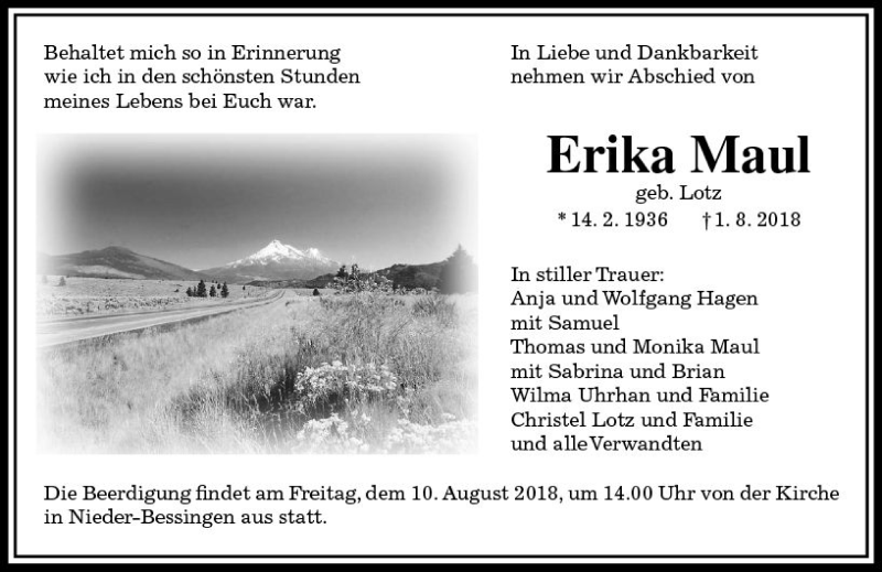 Hier finden Sie alle Traueranzeigen aus der Zeitung, die bisher für Erika Maul erschienen sind. Weitere Traueranzeigen, die in der Zeitung erscheinen, werden hier ebenfalls aufgelistet