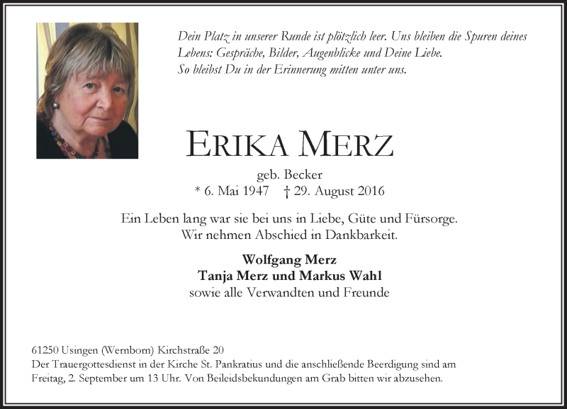 Hier finden Sie alle Traueranzeigen aus der Zeitung, die bisher für Erika Merz erschienen sind. Weitere Traueranzeigen, die in der Zeitung erscheinen, werden hier ebenfalls aufgelistet