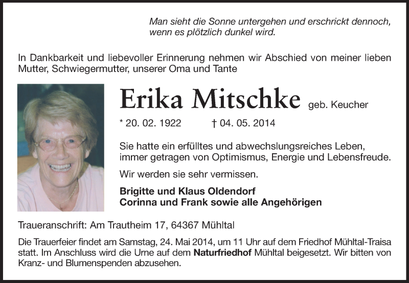 Hier finden Sie alle Traueranzeigen aus der Zeitung, die bisher für Erika Mitschke erschienen sind. Weitere Traueranzeigen, die in der Zeitung erscheinen, werden hier ebenfalls aufgelistet