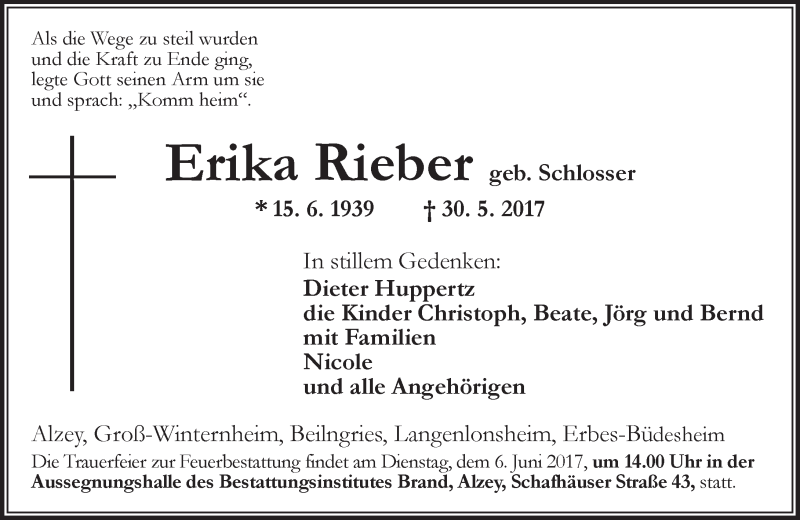 Hier finden Sie alle Traueranzeigen aus der Zeitung, die bisher für Erika Rieber erschienen sind. Weitere Traueranzeigen, die in der Zeitung erscheinen, werden hier ebenfalls aufgelistet