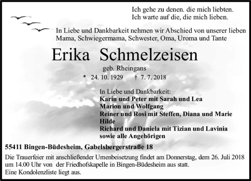 Hier finden Sie alle Traueranzeigen aus der Zeitung, die bisher für Erika Schmelzeisen erschienen sind. Weitere Traueranzeigen, die in der Zeitung erscheinen, werden hier ebenfalls aufgelistet