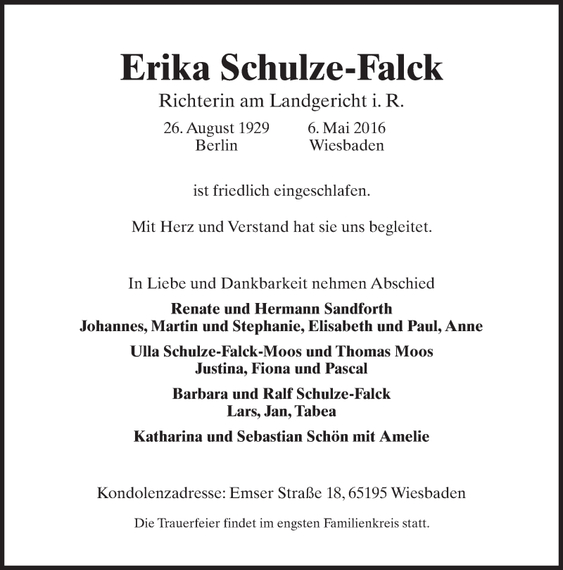 Hier finden Sie alle Traueranzeigen aus der Zeitung, die bisher für Erika Schulze-Falck erschienen sind. Weitere Traueranzeigen, die in der Zeitung erscheinen, werden hier ebenfalls aufgelistet