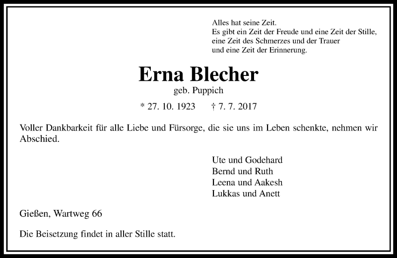 Hier finden Sie alle Traueranzeigen aus der Zeitung, die bisher für Erna Blecher erschienen sind. Weitere Traueranzeigen, die in der Zeitung erscheinen, werden hier ebenfalls aufgelistet