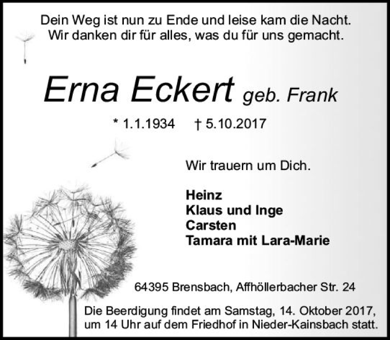 Hier finden Sie alle Traueranzeigen aus der Zeitung, die bisher für Erna Eckert erschienen sind. Weitere Traueranzeigen, die in der Zeitung erscheinen, werden hier ebenfalls aufgelistet