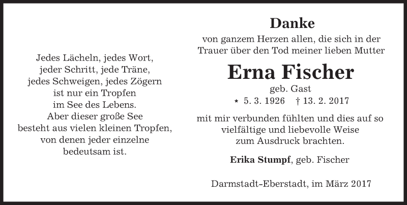 Hier finden Sie alle Traueranzeigen aus der Zeitung, die bisher für Erna Fischer erschienen sind. Weitere Traueranzeigen, die in der Zeitung erscheinen, werden hier ebenfalls aufgelistet