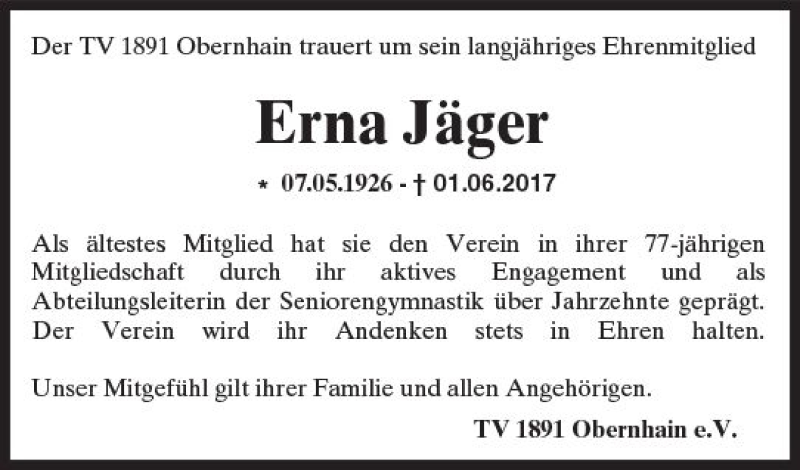 Hier finden Sie alle Traueranzeigen aus der Zeitung, die bisher für Erna Jäger erschienen sind. Weitere Traueranzeigen, die in der Zeitung erscheinen, werden hier ebenfalls aufgelistet