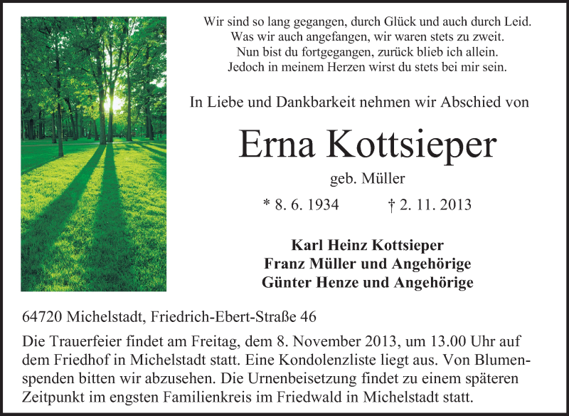 Hier finden Sie alle Traueranzeigen aus der Zeitung, die bisher für Erna Kottsieper erschienen sind. Weitere Traueranzeigen, die in der Zeitung erscheinen, werden hier ebenfalls aufgelistet