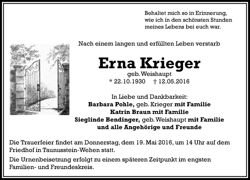 Hier finden Sie alle Traueranzeigen aus der Zeitung, die bisher für Erna Krieger erschienen sind. Weitere Traueranzeigen, die in der Zeitung erscheinen, werden hier ebenfalls aufgelistet