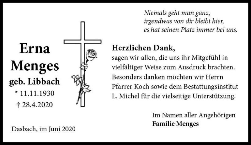 Hier finden Sie alle Traueranzeigen aus der Zeitung, die bisher für Erna Menges erschienen sind. Weitere Traueranzeigen, die in der Zeitung erscheinen, werden hier ebenfalls aufgelistet