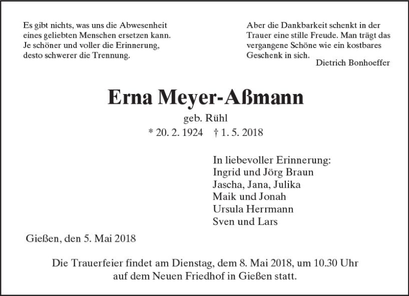 Hier finden Sie alle Traueranzeigen aus der Zeitung, die bisher für Erna Meyer-Aßmann erschienen sind. Weitere Traueranzeigen, die in der Zeitung erscheinen, werden hier ebenfalls aufgelistet