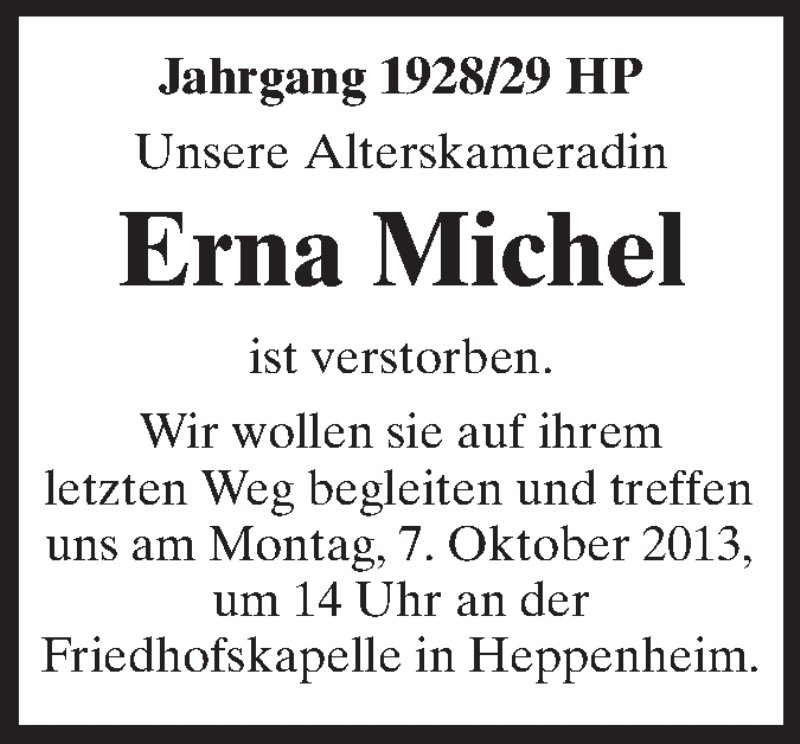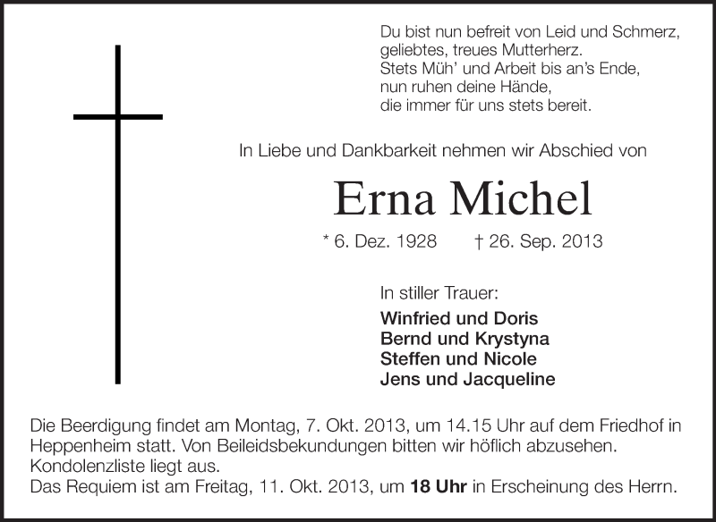 Hier finden Sie alle Traueranzeigen aus der Zeitung, die bisher für Erna Michel erschienen sind. Weitere Traueranzeigen, die in der Zeitung erscheinen, werden hier ebenfalls aufgelistet
