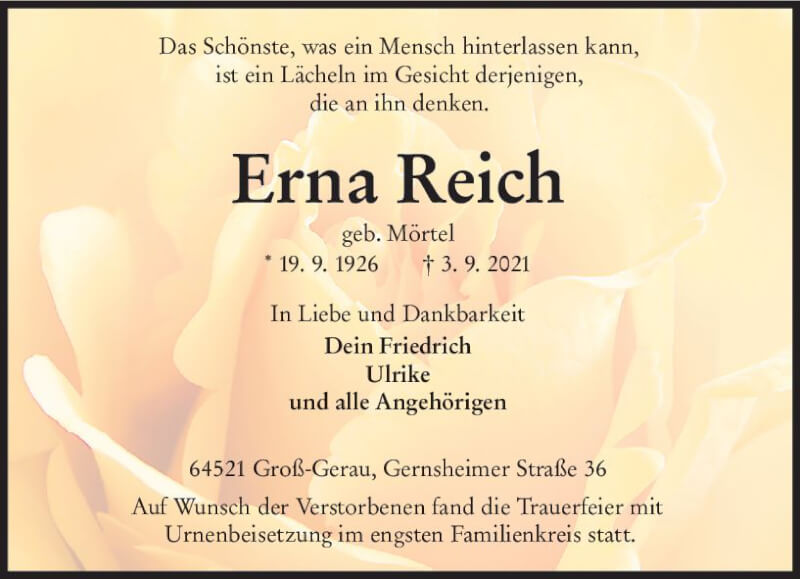 Hier finden Sie alle Traueranzeigen aus der Zeitung, die bisher für Erna Reich erschienen sind. Weitere Traueranzeigen, die in der Zeitung erscheinen, werden hier ebenfalls aufgelistet