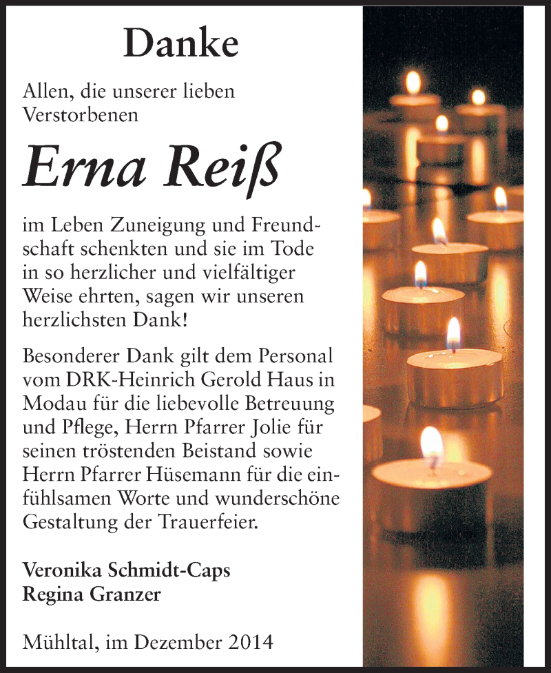 Hier finden Sie alle Traueranzeigen aus der Zeitung, die bisher für Erna Reiß erschienen sind. Weitere Traueranzeigen, die in der Zeitung erscheinen, werden hier ebenfalls aufgelistet