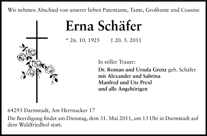 Hier finden Sie alle Traueranzeigen aus der Zeitung, die bisher für Erna Schäfer erschienen sind. Weitere Traueranzeigen, die in der Zeitung erscheinen, werden hier ebenfalls aufgelistet
