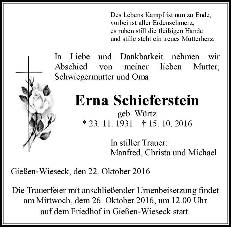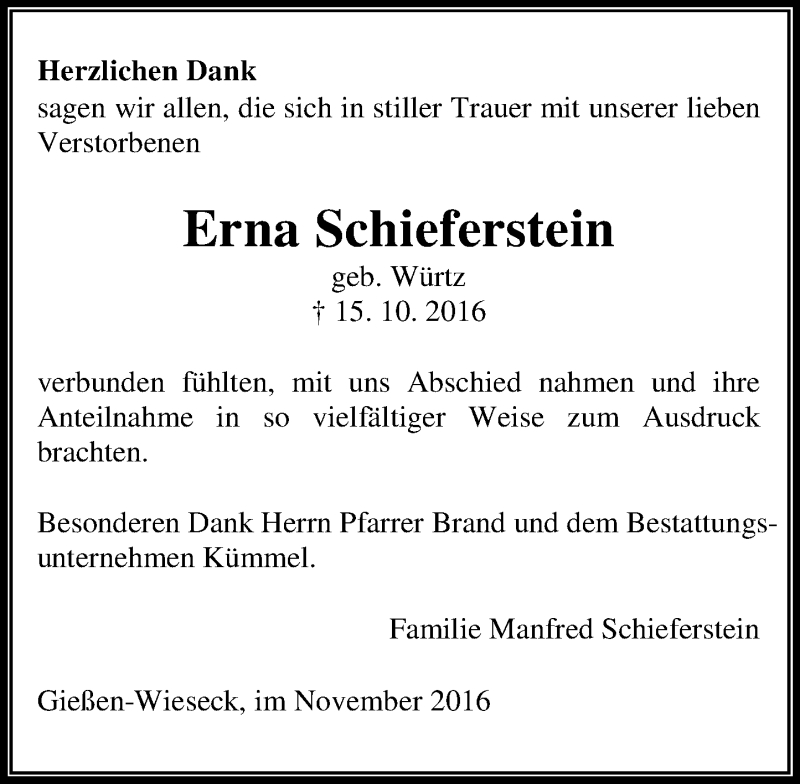 Hier finden Sie alle Traueranzeigen aus der Zeitung, die bisher für Erna Schieferstein erschienen sind. Weitere Traueranzeigen, die in der Zeitung erscheinen, werden hier ebenfalls aufgelistet